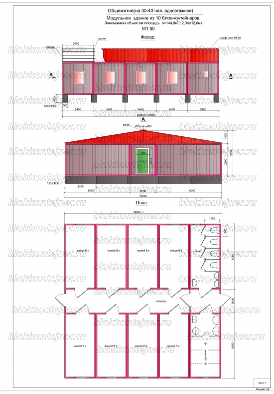 Общежитие на 50 человек, одноэтажное из 16 БК